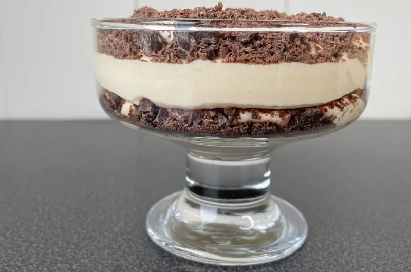 - Finn frem 5 glass eller dessertskåler. Ha fromasj og revet kokesjokolade lagvis i glassene. Først et godt lag fromasj i alle glass. Så halvparten av sjokoladen. Deretter et nytt lag fromasj og så resten av sjokoladen på toppen.(Ta på det siste laget med sjokolade rett før servering)