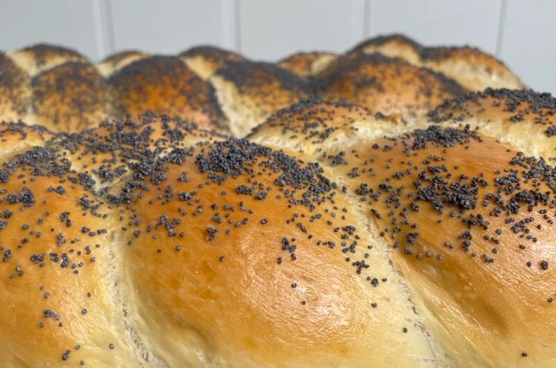 - Pensle med egg og vann og strø over valmuefrø.