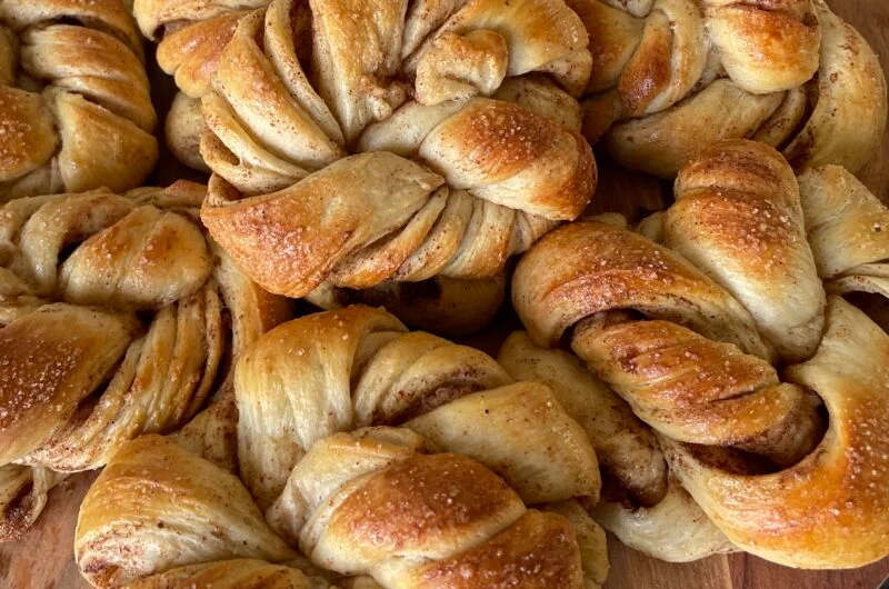 - Ha deigen ut på en lettmelet kjøkkenbenk og kjevle ut en stor firkant. Smør fyllet utover deigen. Brett deigen inn til midten og ta den andre kanten å brett over hele deigen sa du får 3 lag. Kjevle ut igjen. Bruk en pizzakutter til å kutte ca. 18 strimler.,Plukk opp en strimmel, tvist den fra hver sin side og knyt en vanlig enkel knute. Gjør dette med alle strimlene og legg 9 knuter på ett stekebrett.