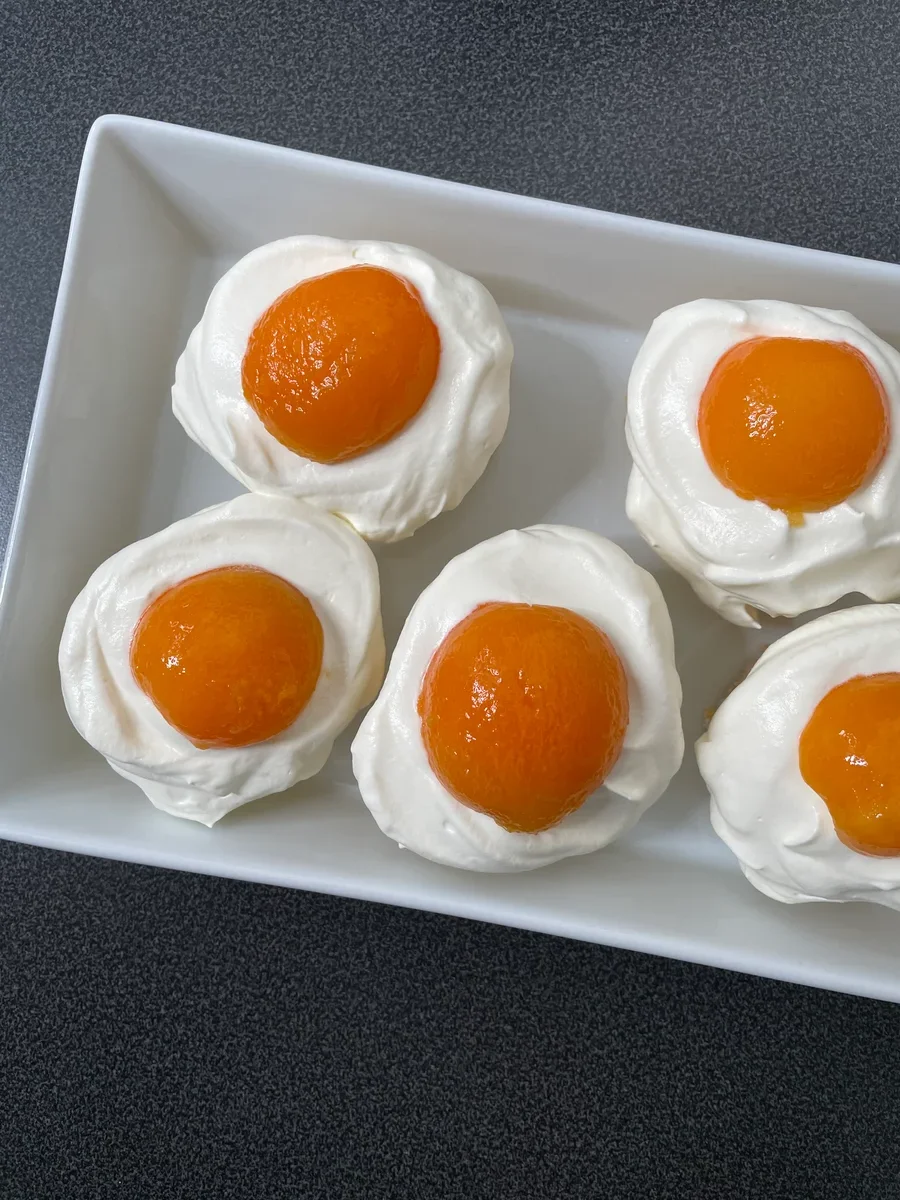 Skiver av rullekake med pisket kremfløte og en halv aprikos på toppen.