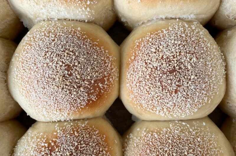 - Legg bollene med strøbrødsiden opp på et bakepapirkledd stekebrett/langpanne (ca. 45x33 cm)