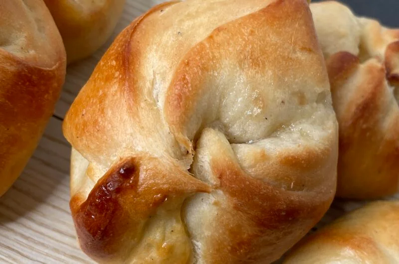 - Legg en klatt (1 ts) vaniljesmør i midten på hver firkant og brett hjørnene mot hverandre.