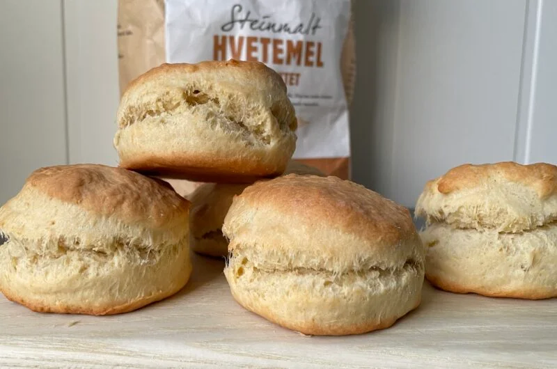 - Bland sammen hvetemel, bakepulver, sukker og salt, men hold igjen litt av hvetemelet. Smuldre inn smøret og tilsett melk og egg. Rør deigen sammen (eller bruk hendene) men ikke arbeid deigen for lenge, da kan den lett bli seig og vanskelig å forme. Er deigen klissete, tilsett resten av hvetemelet.